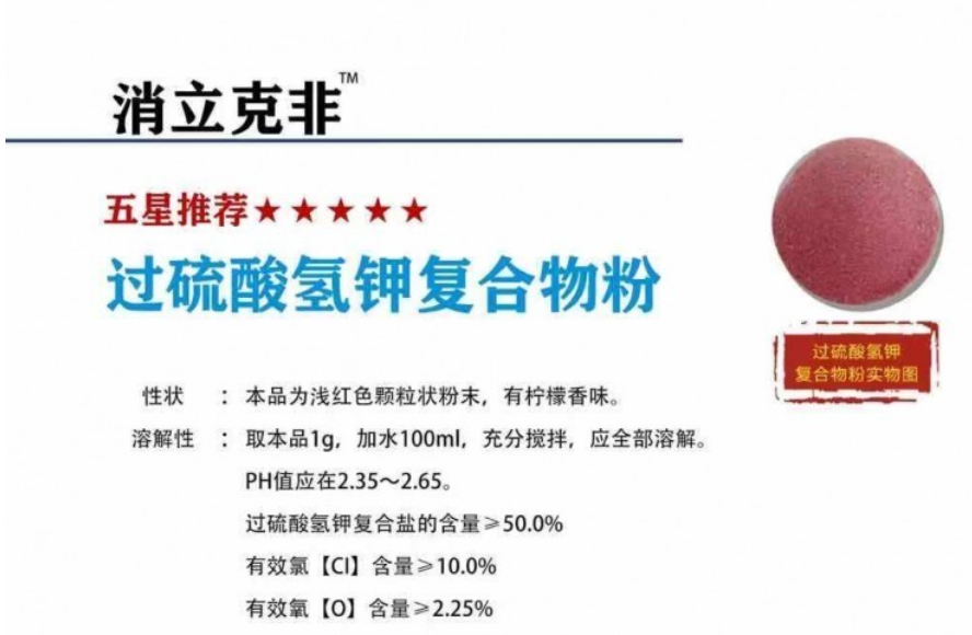 消立克非50%过硫酸氢钾复合盐产品在水中经过链式反应产生次氯酸,新生态氧,氧化和氯化病原体,干扰病原体的DNA和RNA合成,使病原体的蛋白质凝固变性,进而干扰病原体酶系统的活性,影响其代谢,增加细胞膜通透性,造成酶和营养物质的流失,病原体溶解破裂,进而杀灭病原体。