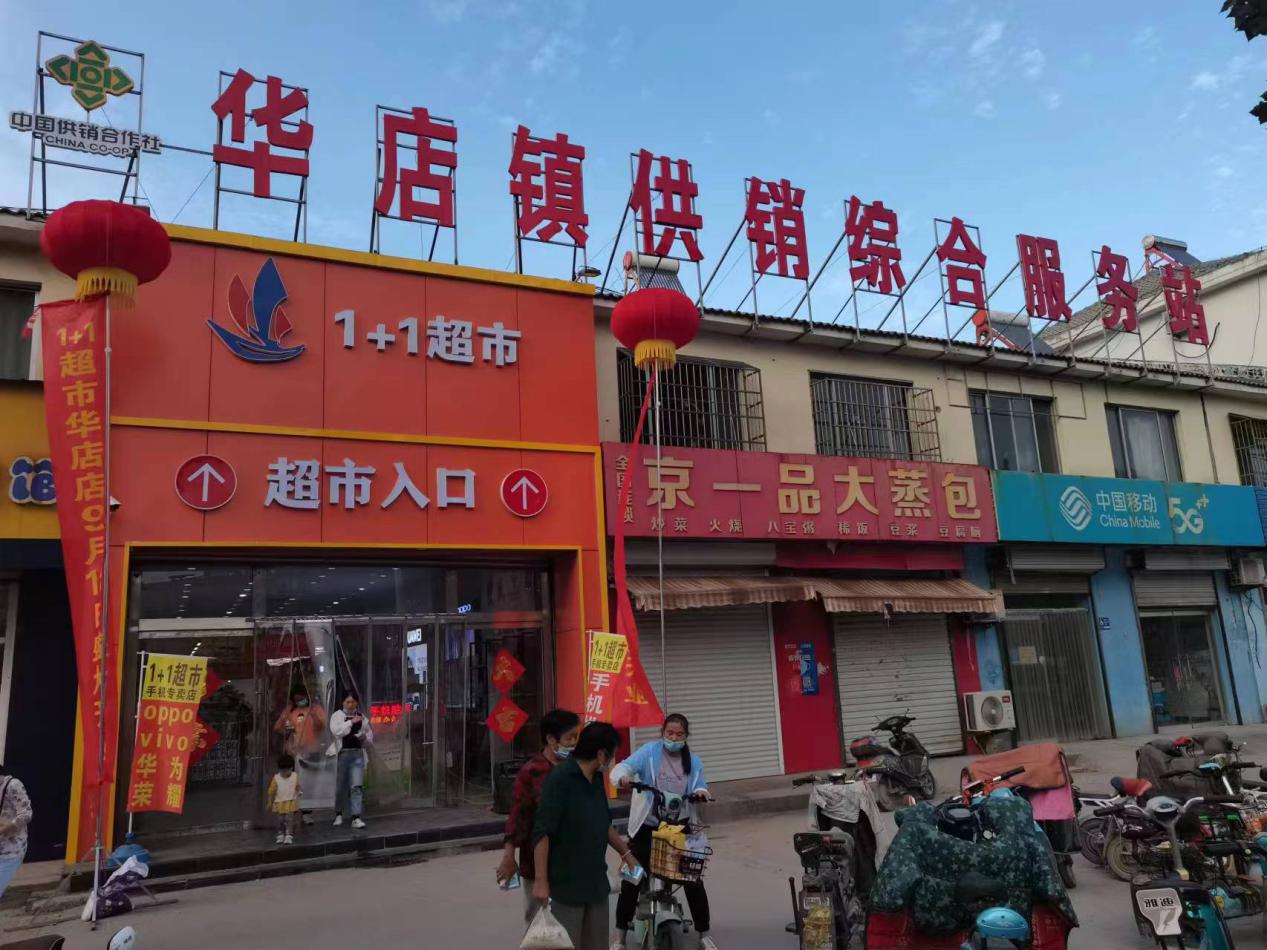 华店供销为农服务中心由华店供销社原杨庄棉站改造提升而成,由华店供销社与粮食收储大户共同运营,占地面积27亩,总投资750万元,建有农资超市展厅300平方米,农机存放库500平方米,粮食储存库3000平方米,拥有烘干设备4台。能够提供农资直供、农机存放与维修、粮食烘干与仓储、病虫害统防统治、日用品超市等专业化、系列化、规模化综合农业服务,打造“三公里土地托管服务圈”,全面构建综合性、规模化、可持续的为农服务新体系。自2018年9月建成以来,年均收储粮食近14万吨,肥料销售600多吨,农药9吨,农机作业服务面积2500亩,统防统治服务面积1600亩。