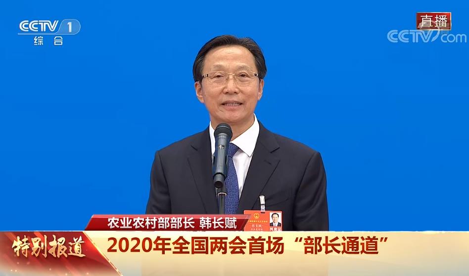农业农村部部长韩长赋答记者问——中国饭碗端得牢,小康之年不缺肉 5月22日上午,十三届全国人大三次会议在北京人民大会堂开幕。会议结束后举行的首场“部长通道”上,农业农村部部长韩长赋就粮食安全、生猪生产、产业扶贫问题回答记者提问,回应社会关切。粮食安全底气足,今年又是丰收年粮食安全关乎国计民生。今年全球新冠肺炎疫情蔓延,国际粮食市场出现较大波动。粮食安全再次成为社会关注的话题。韩长赋非常肯定地回应社会关切,“中国不会发生粮食危机”,并用四句话给大家吃下“定心丸” 三农联播 2020年05月25日 0 点赞 0 评论 669 浏览